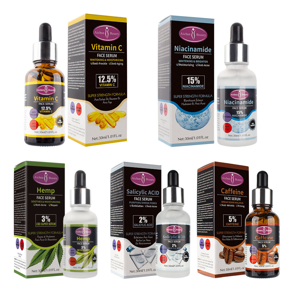 Product Specifications: 30ml Vitamin C Facial Essence, 30ml Niacinamide Facial Essence, 30ml Essence, 30ml Salicylic Acid Facial Essence, 30ml Caffeine Facial Essence